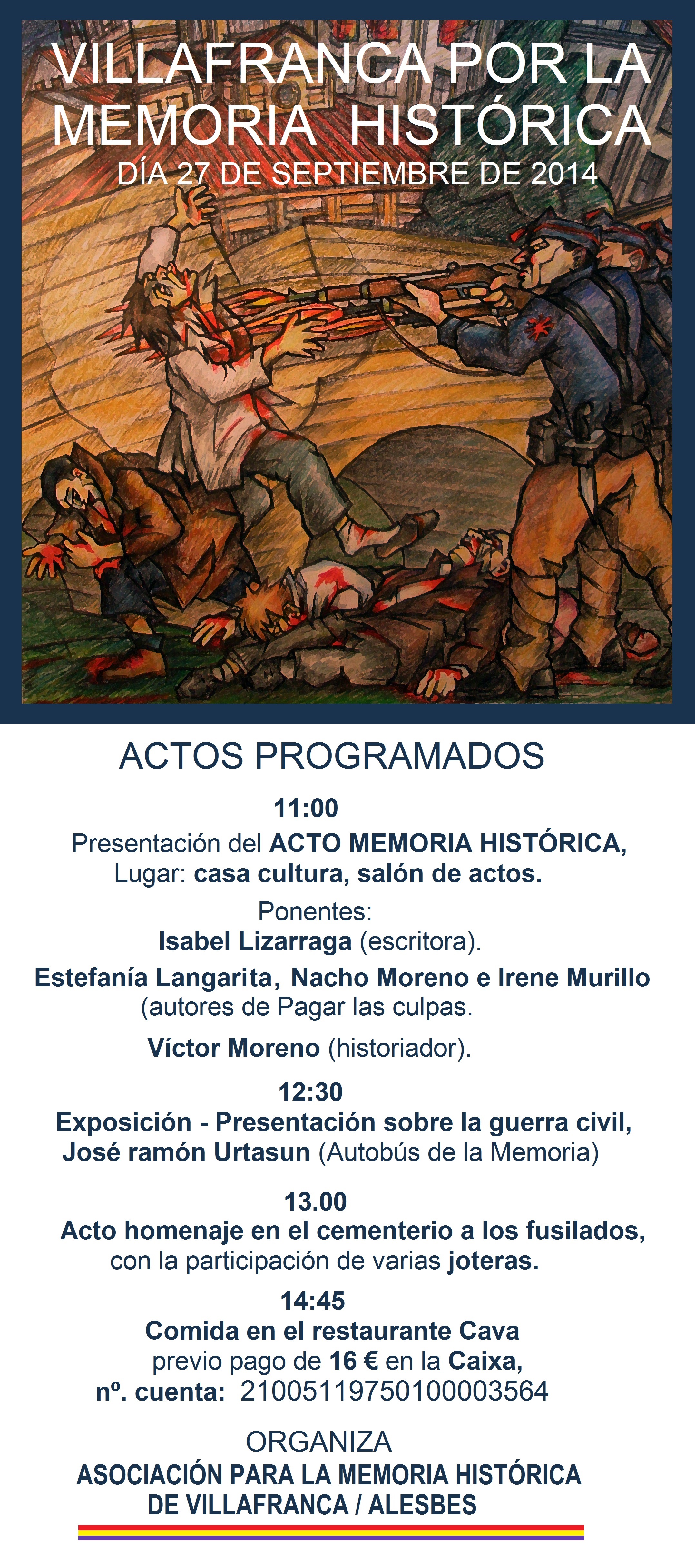 La Asociación para la Memoria Histórica de Villafranca/Alesbes me invitó el pasado 27 de septiembre a participar en una jornada conmemorativa, que comenzó en el Salón de Actos de la Casa de la Cultura de Villafranca. (http://www.noticiasdenavarra.com/2014/09/16/vecinos/tudela-y-ribera/villafranca-celebrara-una-jornada-por-la-memoria-historica).