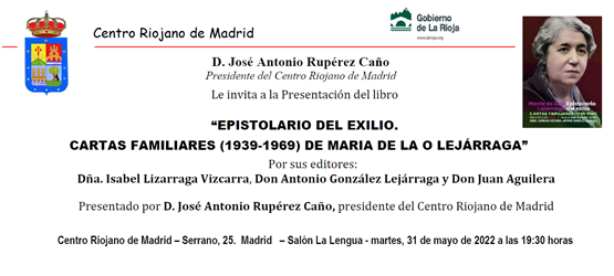 María de la O Lejárraga en el Centro Riojano de Madrid Posted on mayo 17, 2022 por islizarr Responder El martes 31 de mayo os esperamos en el Centro Riojano para hablar de María Lejárraga