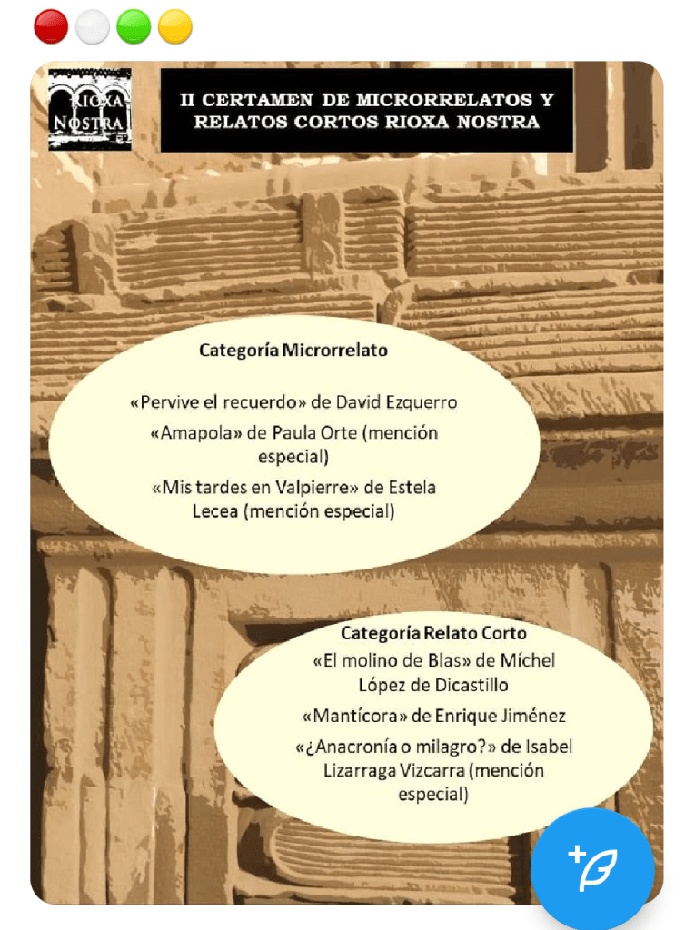 Gracias a la Asociación de Amigos de la Rioja por haberme concedido esta Mención especial en el II Certamen de relatos cortos Rioxa Nostra. Cuando escribí ¿Anacronía o milagro? quise contar una historia donde se mezclase el presente y el pasado, lo mismo que hacía Julio Cortázar en alguno de sus cuentos. Con el escenario de la fiesta del Once de junio en Logroño, inventé la aventura de unos abueletes con sus nietos a quienes se les cruzan los guerreros del Sitio, descritos con el lenguaje de las novelas de caballerías que leí cuando era estudiante de Filología Española.